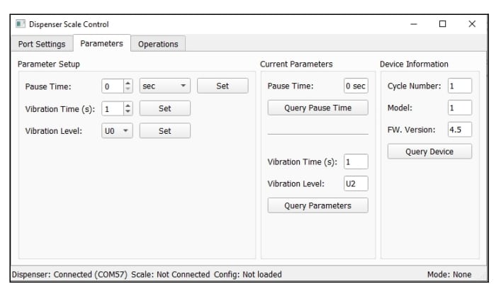 SDB-1、SDB-2, SDH-1を、ミニUSB経由でPCとつなぎ、遠隔で制御するソフトウェアとなります。Windows10、Windows11で動作します。指定の重量スケールをPC経由で接続させれば、分注ごとのログの記録と共に、目標重量に応じて自動で分注を繰り返すクローズとループを構築可能です。